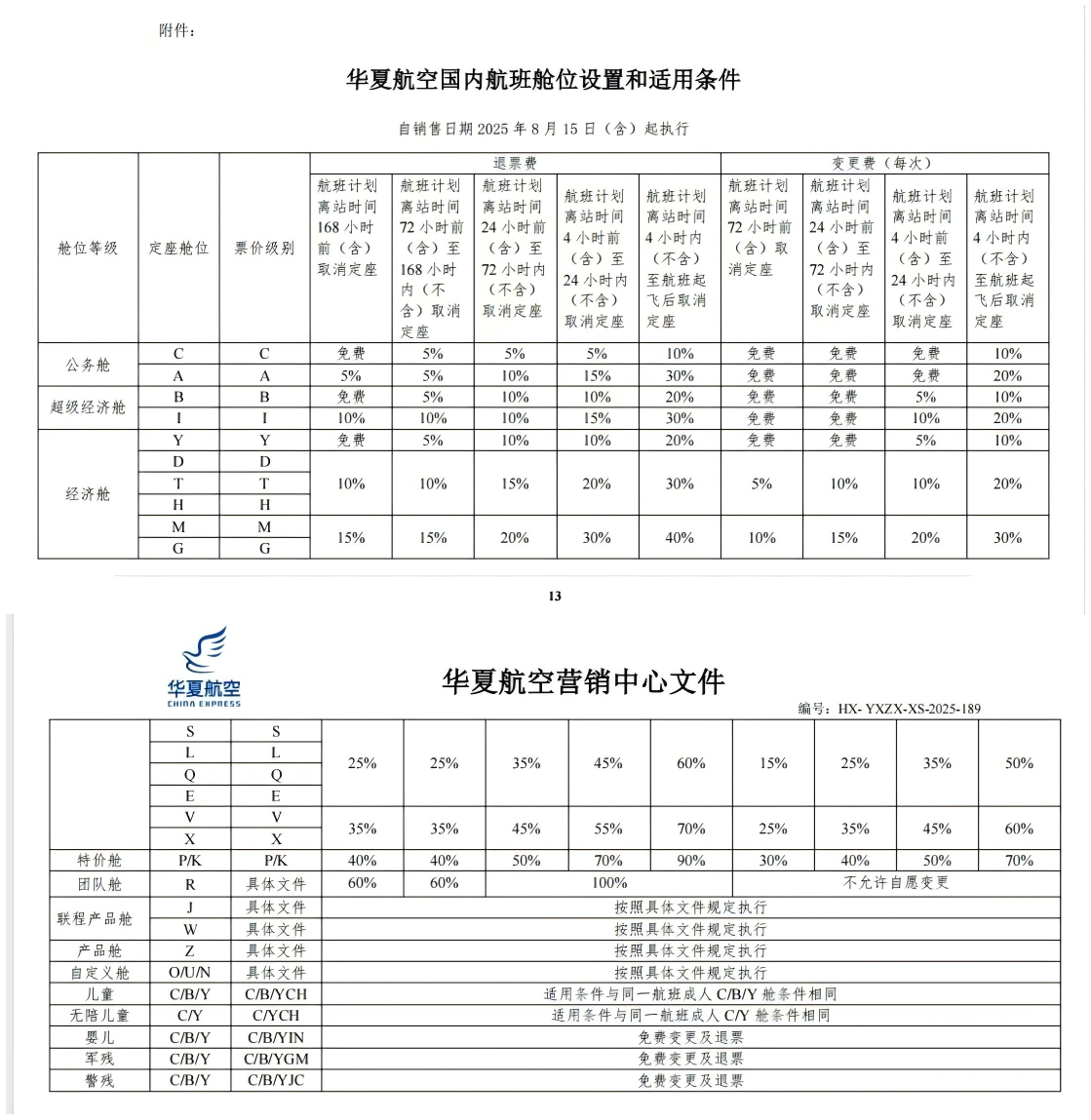 | 华夏航空 O 舱退改规则 | ||||||||||||