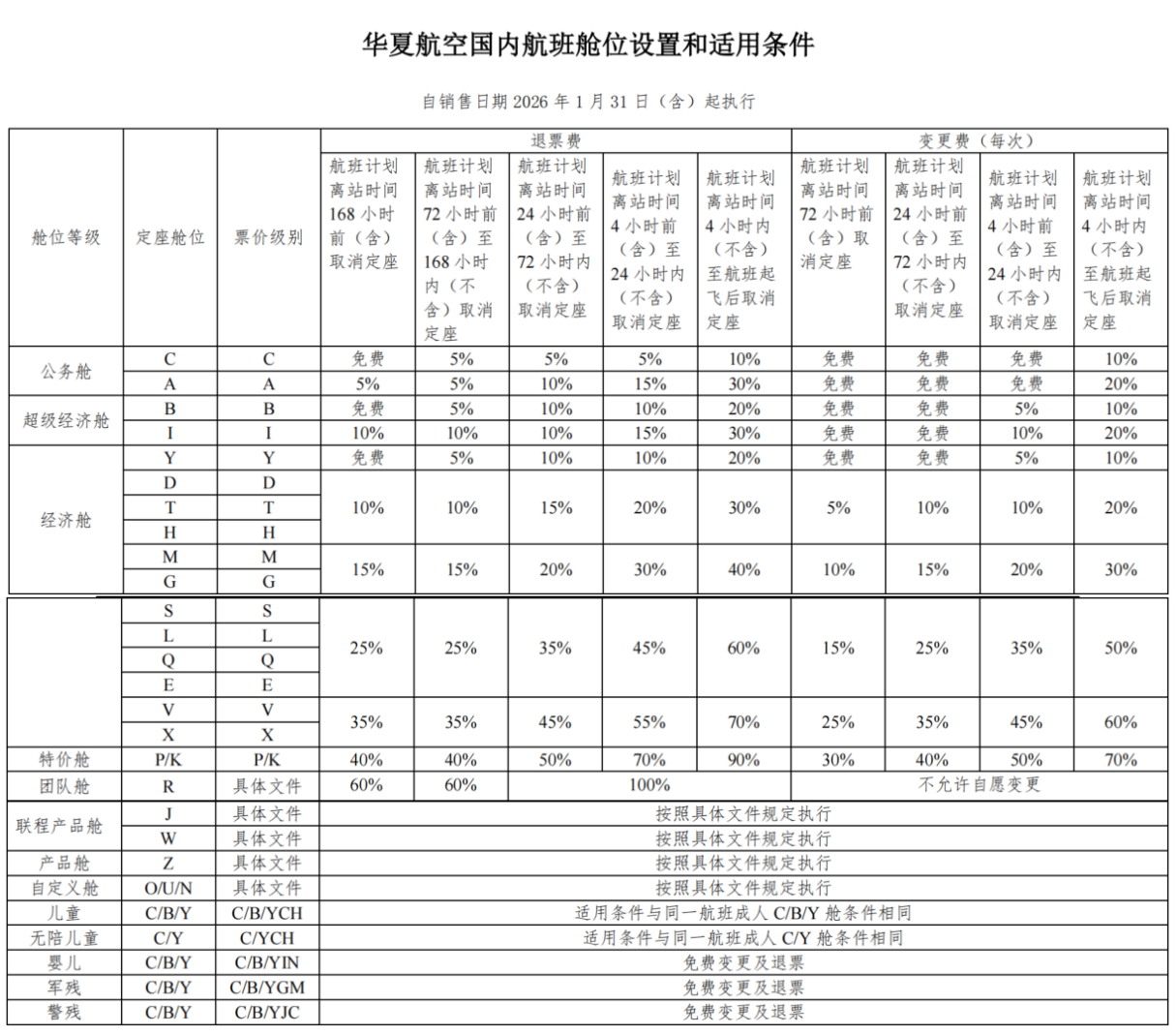 【新客规】华夏航空 O 舱退改规则