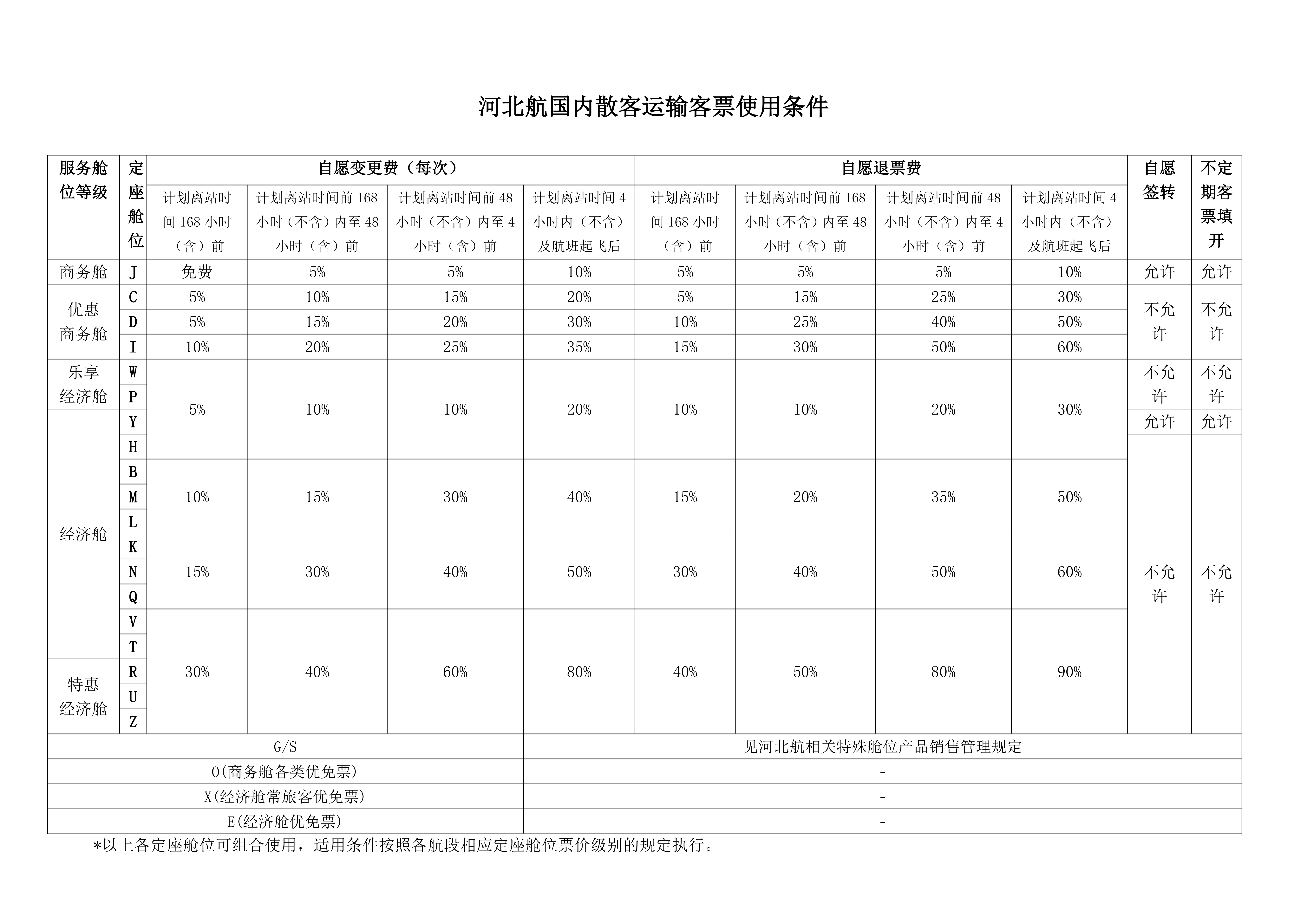 | W/X/B/U/O | 见河北航相关特殊舱位产品销售管理规定 | ||||||