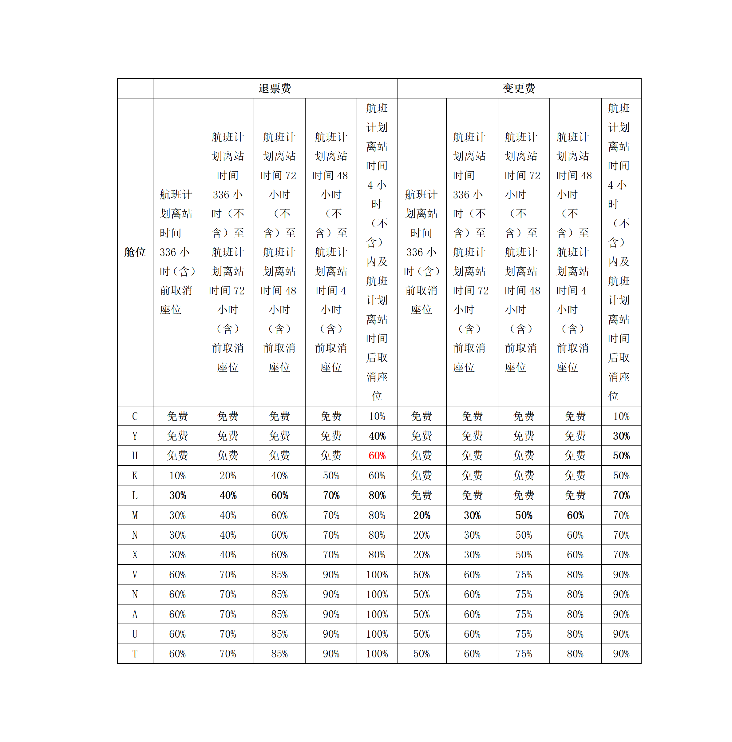 | 航班计划离站时间336小时(含)前取消座位 | 计划离站时间336小时(不含)内至72小时(含)前取消座位 | 计划离站时间前72小时(不含)内至48小时(含)前取消座位 | 航班计划离站时间48小时(不含)至航班计划离站时间4小时(含)前取消座位 | 航班计划离站时间4小时(不含)内及航班计划离站时间后取消座位 | 航班计划离站时间336小时(含)前取消座位 | 计划离站时间336小时(不含)内至72小时(含)前取消座位 | 计划离站时间前72小时(不含)内至48小时(含)前取消座位 | 航班计划离站时间48小时(不含)至航班计划离站时间4小时(含)前取消座位 | 航班计划离站时间4小时(不含)内及航班计划离站时间后取消座位 | ||||