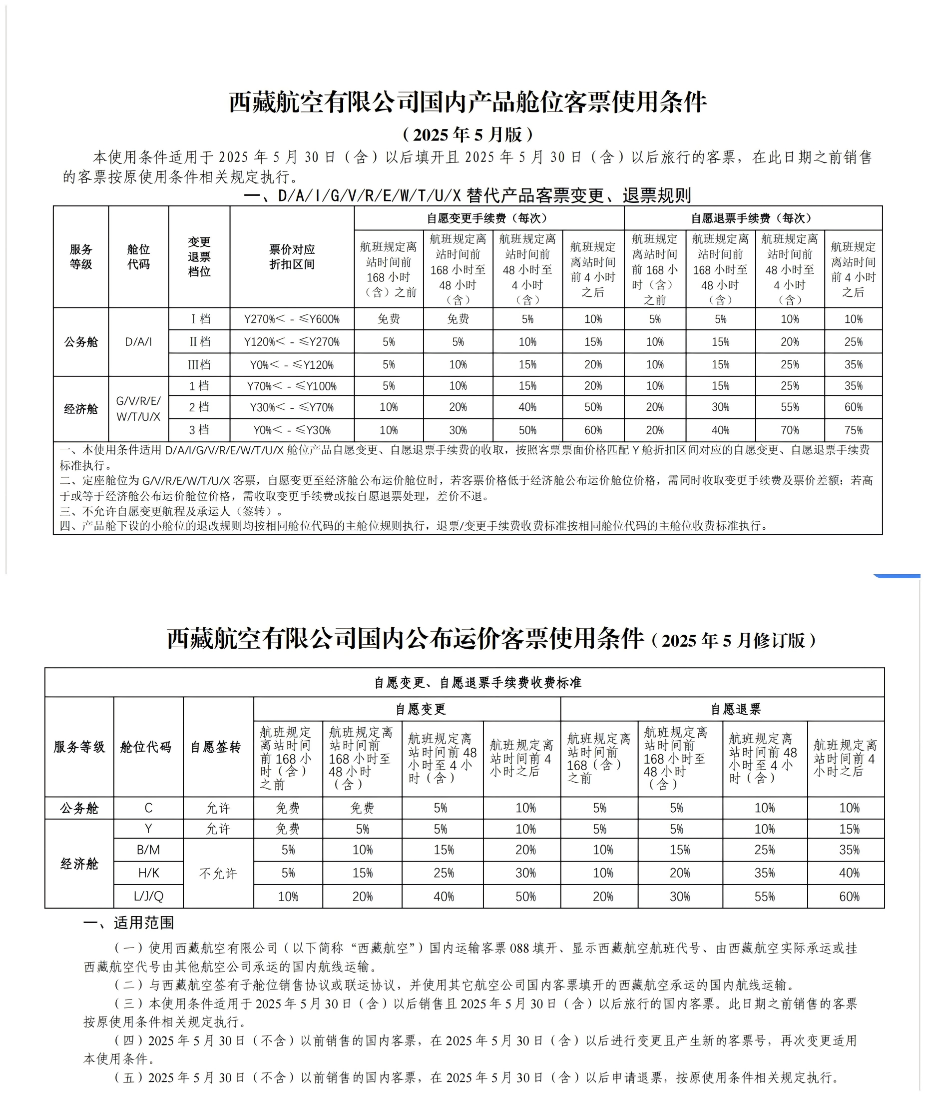 1、适用范围:各销售代理人使用BSP、B2B销售的客票 2、涉藏航线Y舱自愿改期、退票规定: 适用于销售林芝、邦达、阿里、日喀则进出港航班的客票;儿童、婴儿、军(警)残旅客不适用 3、不在此期间的客票改期到此期间,均按照此规定执行。 4、此期间的客票改期到不是此期间,均按照此规定执行。 5、Y舱自愿改期、退票规定办理 |